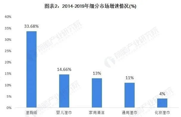 隨著(zhù)我國人民個(gè)人衛生意識的不斷提高,人們對濕巾的需求越來(lái)越大,對濕巾品類(lèi)和原料的要求也越來(lái)越高。因此濕巾品類(lèi)不斷豐富,出現更多具有較強針對性的產(chǎn)品,比如濕廁紙、嬰兒用紙、廚房濕巾、卸妝濕巾等。目前我國市場(chǎng)中嬰兒濕巾仍占據主要市場(chǎng)份額,但濕廁紙增速迅猛,高達33.68%,有望趕超嬰兒濕巾。