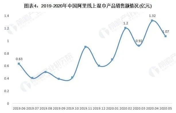 2020年疫情呈現爆發(fā)極大地刺激了濕巾的消費需求,2020年1-5月,阿里濕巾線(xiàn)上銷(xiāo)售額均在1億元左右,2020年4月銷(xiāo)售額更是高達1.32億元,2020年2月環(huán)比增速達到113.63%。